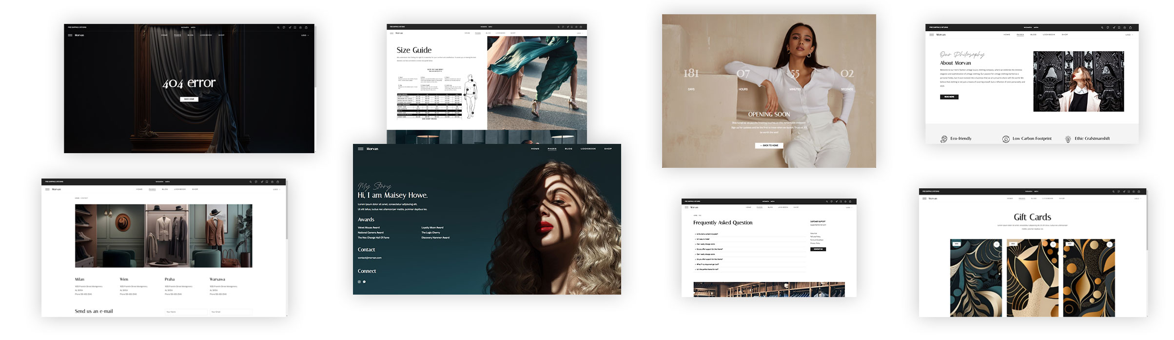 Morvan offers an impressive range of internal pages that allow you to effectively showcase your business, highlight your clients, present size guides, gift cards, and much more.